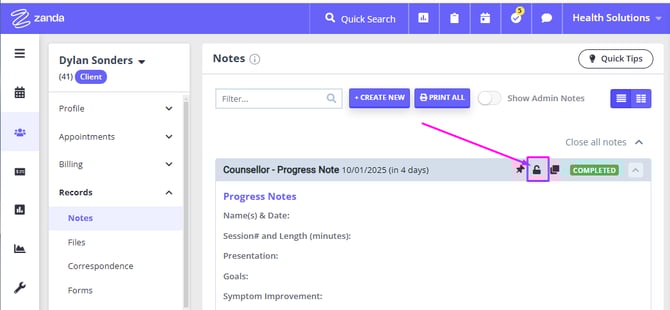 1. Go to the client's Profile > Records > Notes, click the lock icon to unlock the note.