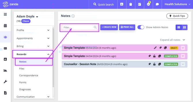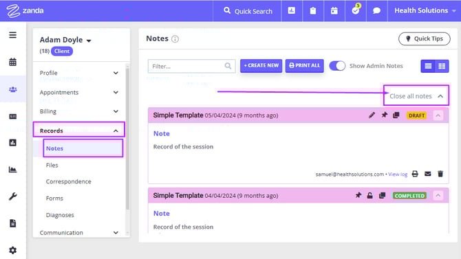 - You can simply go to the client's profile, navigate to their Records → Notes and click Print All.