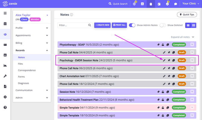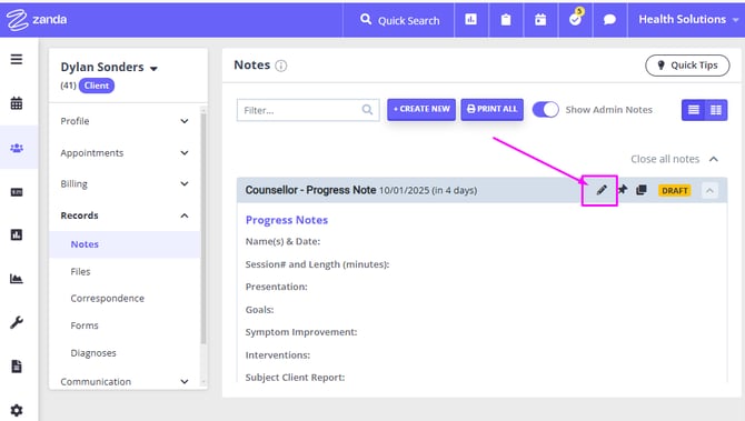 Open a session note on Client Profile > Records > Notes page