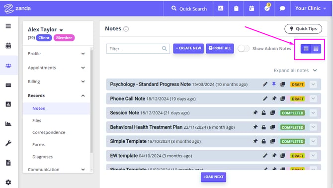 - If the note being opened is not part of the initial view on the Client Profile > Records > Notes page (i.e. the user must click “Load next” to see it) then the note will not be opened, just the Client Profile > Records > Notes.