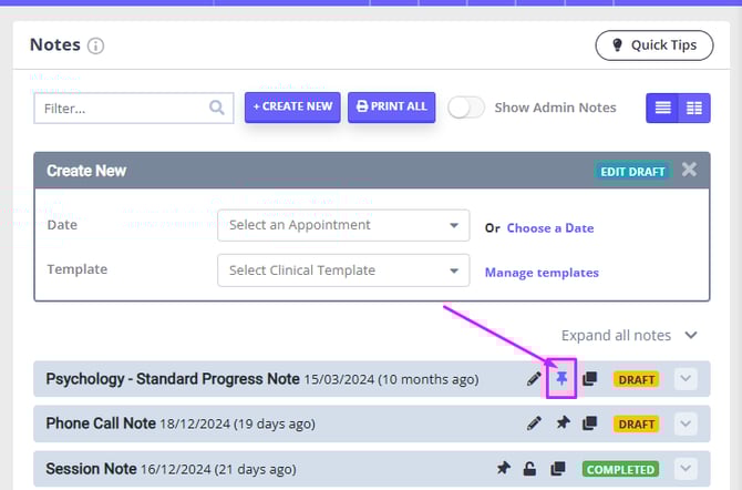 - If a particular Session Note is important to your client's long-term planned treatment, you can click on the pin icon which literally pins it to the top of the page regardless of its age, saving you time searching and scrolling.