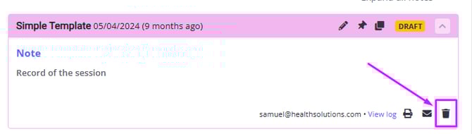 - When the note is in the Draft status, scroll to the bottom-right of the note draft and click the trash bin icon.
