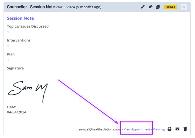- At the bottom of the note, you will see a hyperlink for its associated appointment 'VIew Appointment'.