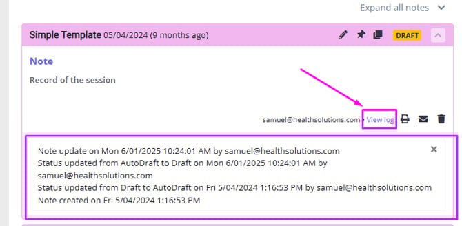 Each session note created has a user activity log at the bottom-right of a note. Click on the View Log hyperlink to open the log to view all recorded system and user actions.