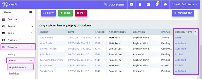 The Reports > Clients > Appointments report allows to generate a report with the Session Note column, that column will contain the information if the session note was created, drafted or completed for the appointment.