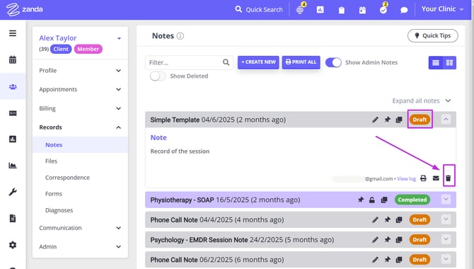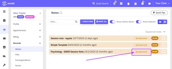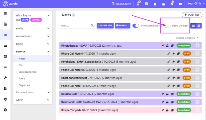 - Turn on the 'Show Deleted' switch at the top of the client's Notes page:
