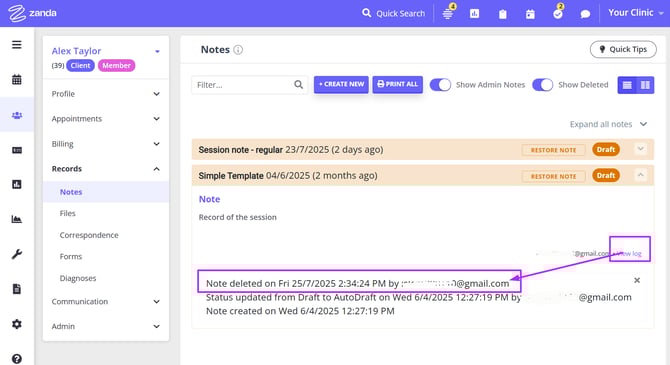 - The deleted note can be found in the client profile under the 'Show Deleted' switch for the next 30 days after it was deleted. The note log will have a record of who and when deleted this note: