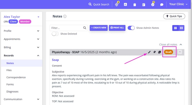 - Make sure the note is in the Draft status, and click the 'pencil' icon on the note header to switch it to editing mode;