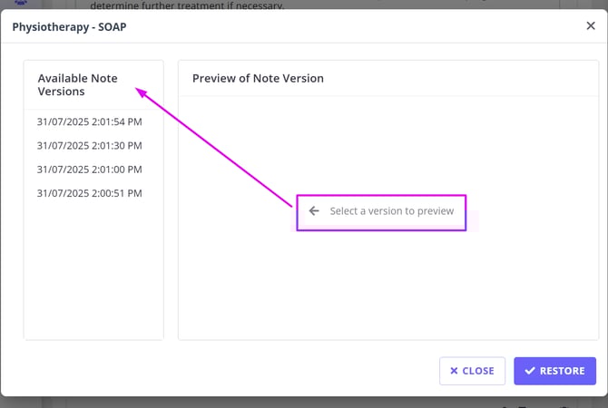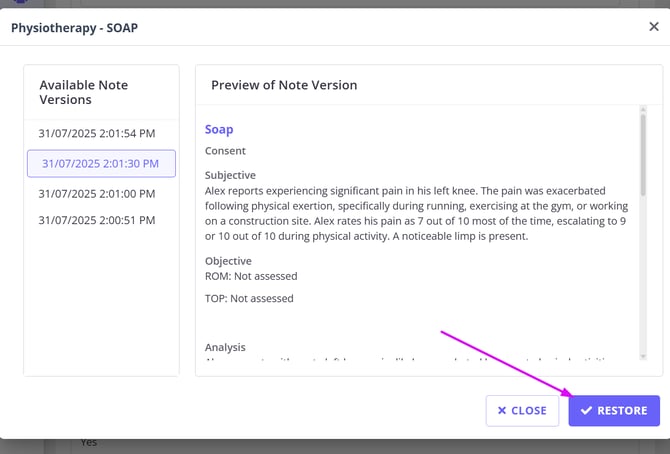 A timestamped entry will be added to the note log each time a version is restored, keeping your records clear and auditable