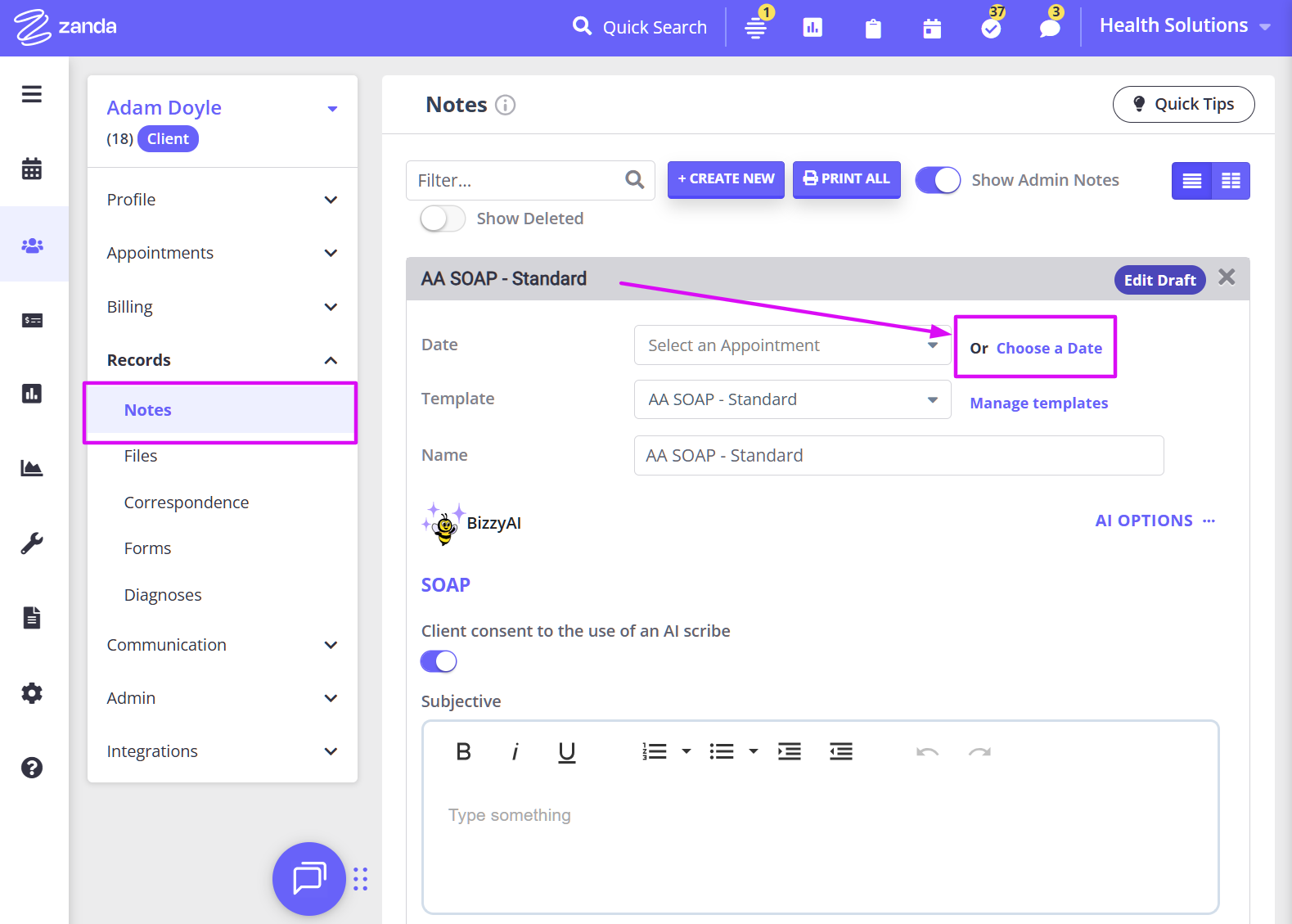 - Open client profile in Records > Notes or Admin > Admin Notes;