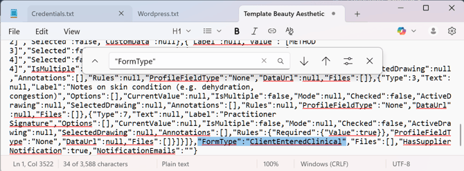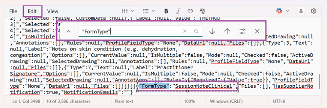 5. You should find this line (it will only appear once in the file): "FormType":"SessionNoteClinical"