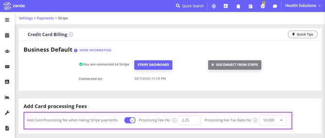 When this feature is enabled, Zanda automatically adds a percentage-based fee to all card-not-present Stripe payments made through the Zanda account, including payments made by clients via the client portal and payment links.