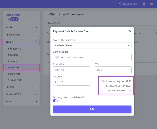 Zanda gives you the option to automatically add Stripe card processing fees to client payments—helping your practice recover transaction costs while keeping billing transparent for your clients.