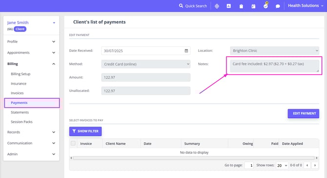- Once processed and saved, the payment record will include a note regarding the processing fee and tax amount included.