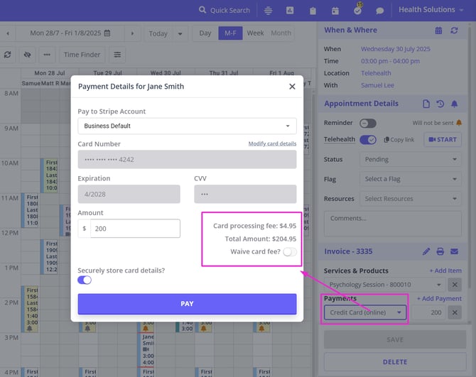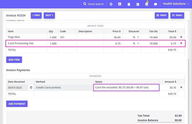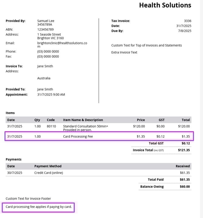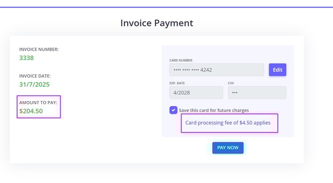 A ‘Card Fee’ line item and a payment note is added to the invoice