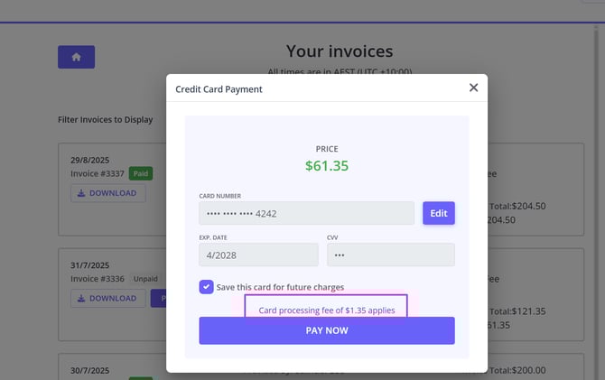 Invoices include a Card Processing Fee item and display a footnote: “Card processing fee applies if paying by card.”