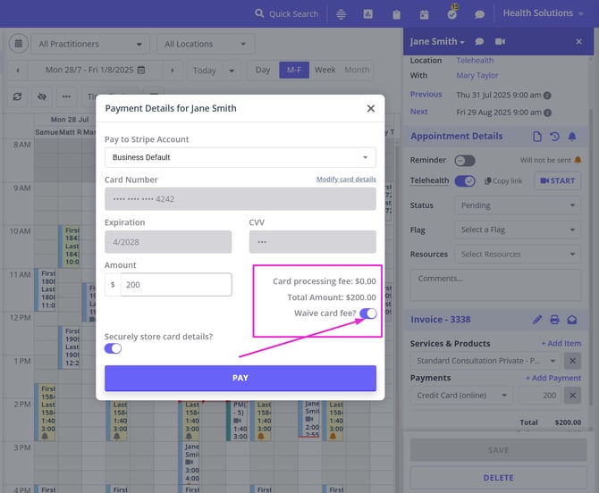 Zanda gives your team the flexibility to waive the card fee manually during payment processing in the Zanda account. This can be done by turning on the 'Waive card fee?' switch on the payment modal: