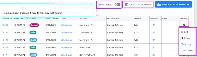 - Actions: the actions menu allows to make edits, delete or resubmit the claim and view its submissions history