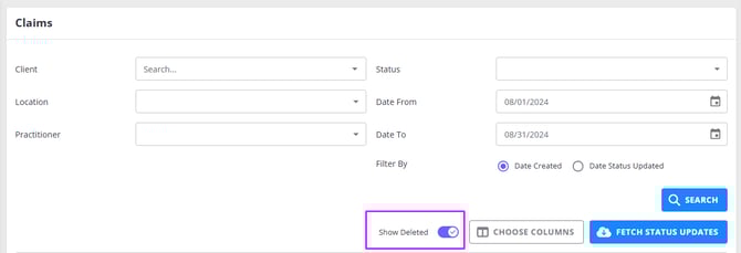 - To see the deleted claims, enable the 'Show Deleted' switch below the filter, before you run the search: