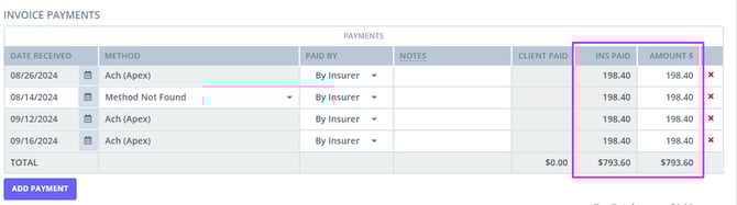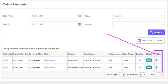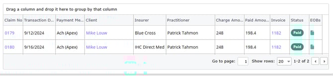Multiple claims from the same client and payer can be grouped under one EOB. These payments are listed separately in the system for each claim.