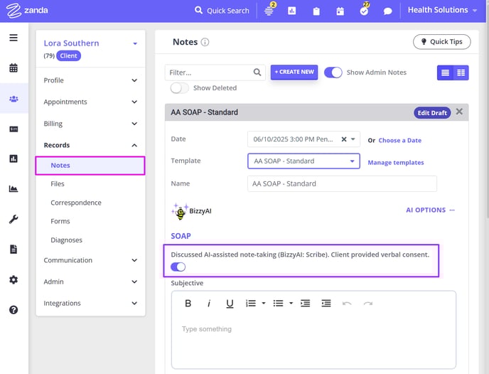 BizzyAI: Scribe streamlines your session note-taking by generating structured, professional, and compliant documentation efficiently. When using BizzyAI: Scribe during client appointments, it's essential that clients are informed and provide their consent for the use of AI.