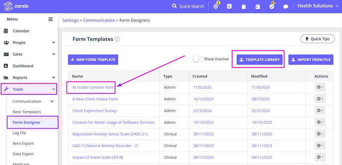 Zanda offers a pre-loaded AI Scribe Consent Form template, accessible to all users, which can be shared with clients to efficiently collect and document their consent for the use of AI Scribe during sessions.