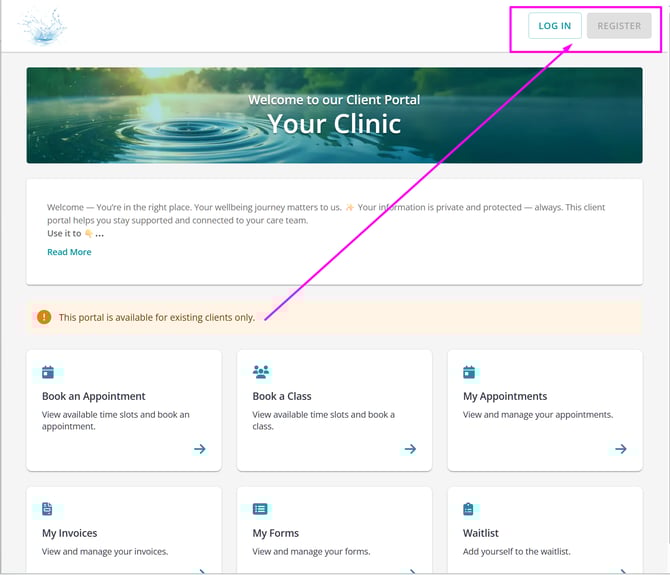 Selecting any portal feature that requires login (e.g., “Book Appointment,” “Book Class")
