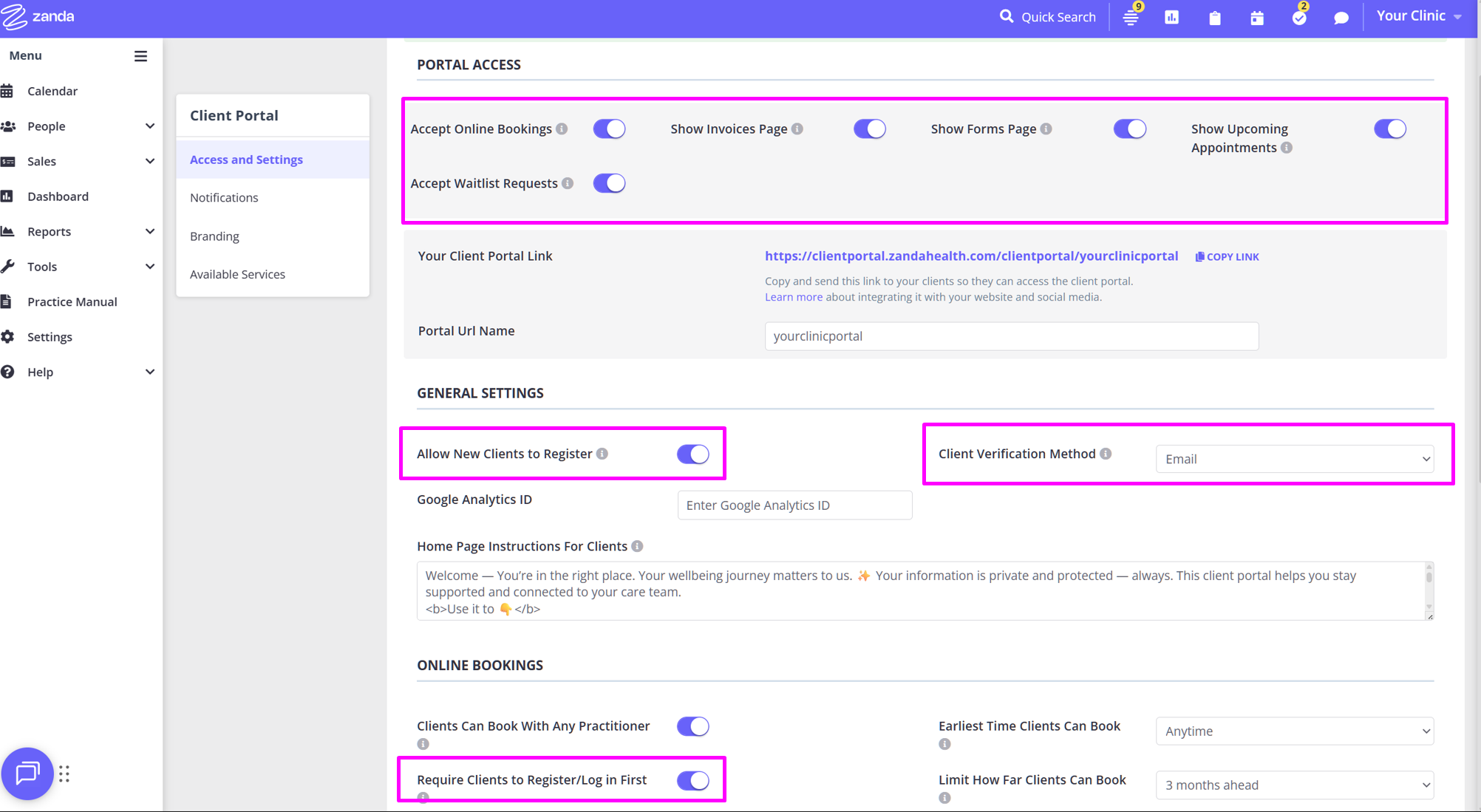 Important Note: If you disable "Allow New Clients to Register," Zanda automatically enables the 'Require Clients to Register/Log in First' setting to prevent new visitors from accessing your portal.