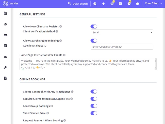 Pro Tip: If you want to collect more client information when they register, use the New Client Intake online form embedded in the Client Portal registration confirmation message which Zanda will send automatically after you've set it up once. Learn more here.