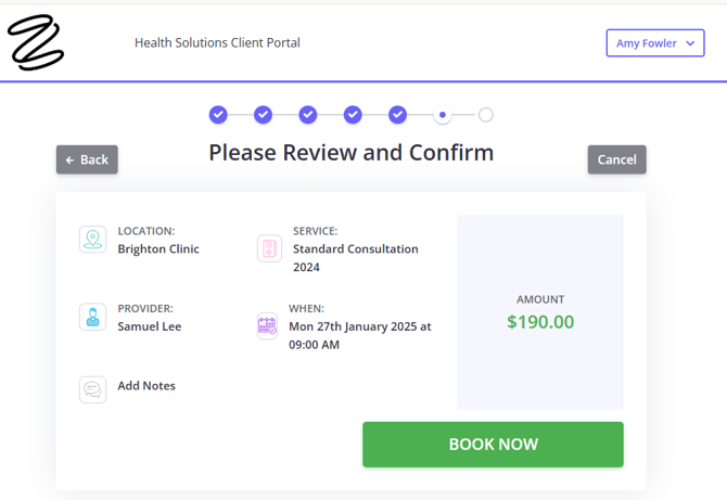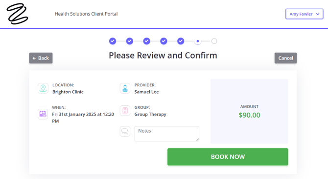 - On the Appointment Booking form, you are able to leave a Note for the practitioner.