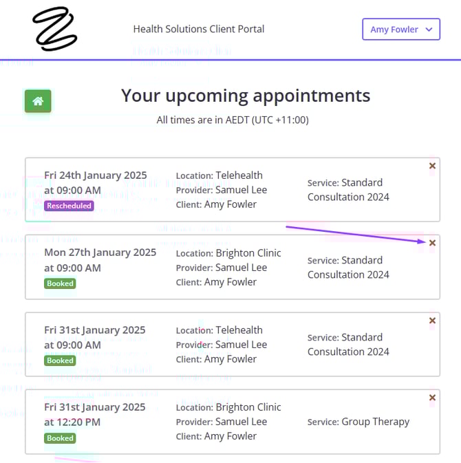 Your Client Portal home page will display the times in your local time zone. If your practitioner lives interstate or in another country, the appointment confirmations and reminders will include the appointment start and end times in your time zone. Otherwise, the practitioner's local time zone will be mentioned in the confirmations and reminders.