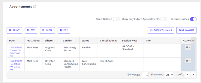 You can choose different filter options if you would like to see future appointments only or deleted appointments.