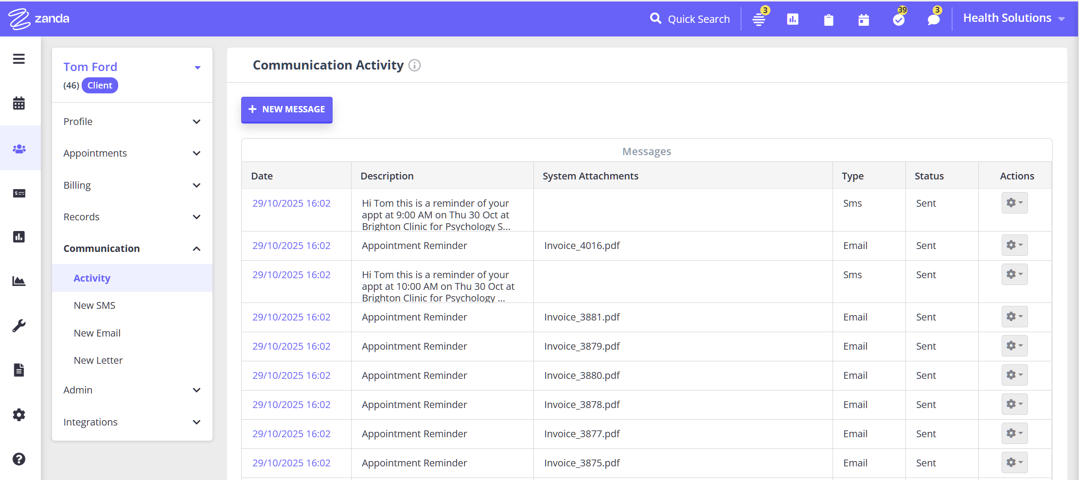On this page you will see a list of all sent and received communication, SMS, email and letters, within the last twelve months.