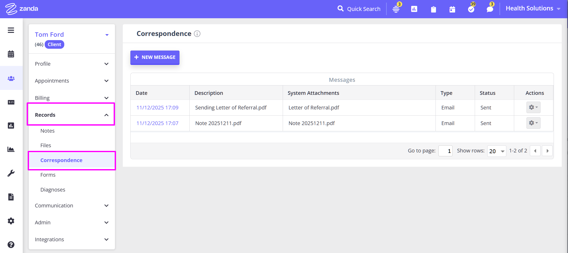 - All automated messages which were manually saved to correspondence by Zanda users.