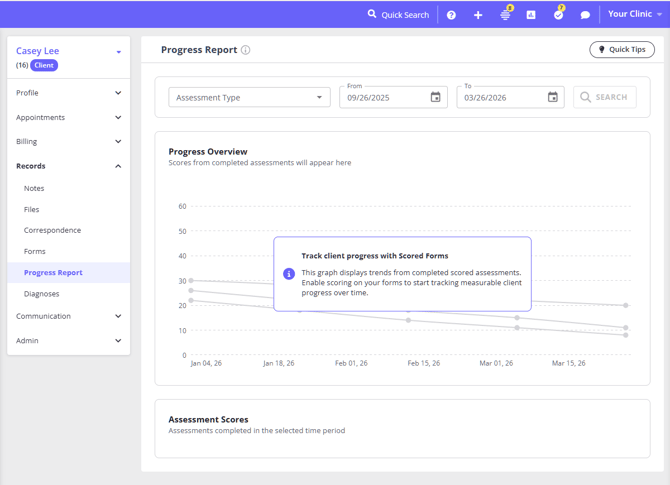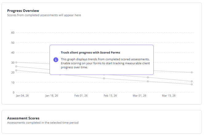 Client Progress Report helps you clearly see how a client’s scored assessments are changing over time, all in one place. You can track trends, compare results, and review individual form responses without needing to open each form separately.