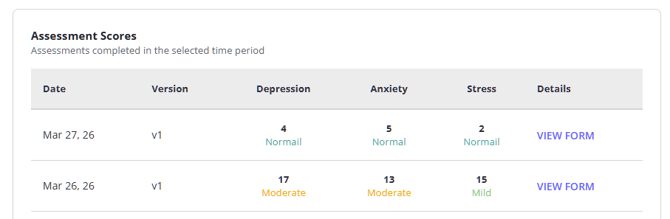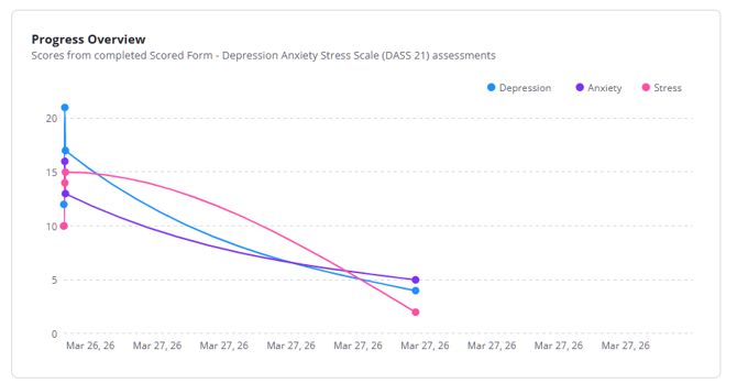 Client Progress Reports bring together scored assessment data into a clear, easy-to-read view. A visual trend graph, and a detailed table help you can quickly understand progress while still having access to the full context behind each result.