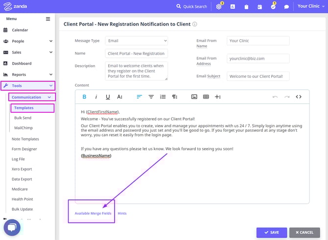 - Create a new email or SMS template, or open an existing one to edit. We decided to use the "Client Portal - New Registration Notification to Client" as an example. This template is automatically sent to each new client who registers via your Client Portal in Zanda.