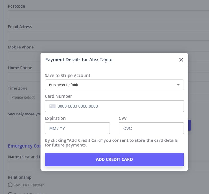 - Type in the client's Credit Card details and save. The details will be stored in your connected Stripe account.