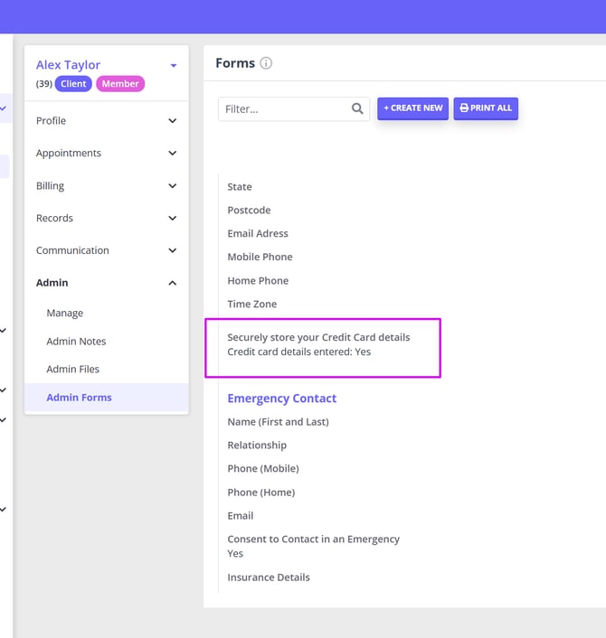 5. When the form is submitted by the client, it will be saved in Completed status in Client Profile > Records > Forms (and Admin > Admin Forms if it is an Admin-type form). The actual Credit Card details are transmitted and stored into your connected Stripe account, ensuring security.