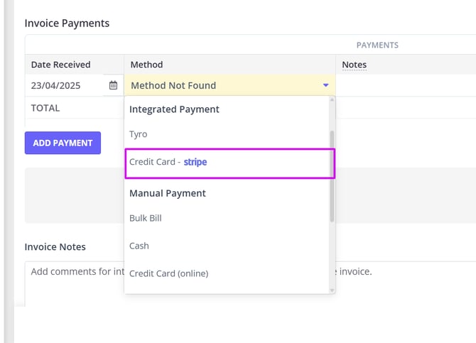 - Navigate to an invoice that you would like to process a credit card payment for (via the Client Profile under Billing > Invoices or via one of the Reports). Click on the Invoice Number, under the Payments section of the Invoice click "Credit Card - Stripe" in the Method drop-down list.