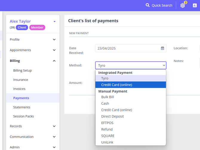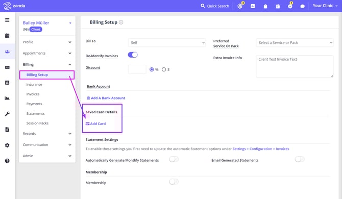 Besides the above two options, clients' credit card details can be captured and stored for future use when their payment is processed via Stripe by either a Zanda user, or when processing a payment via the Client Portal.