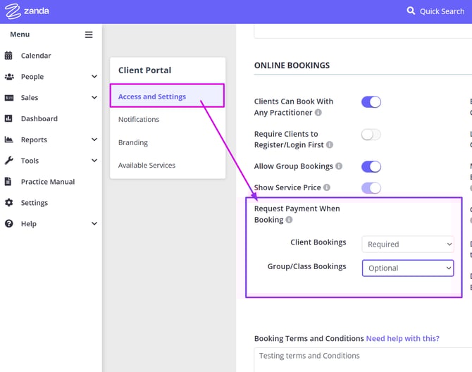 - In Settings > Schedule > Client Portal > Access and Settings, set the 'Credit card payment required when booking' as necessary: