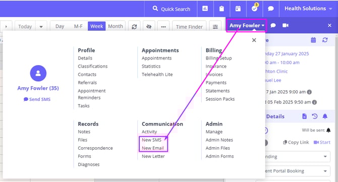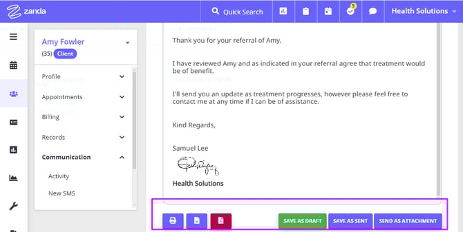 You can send SMS and emails to a client from within their client record, as well as generate letters and store them for reference in the future (or to be printed or sent to PDF or Word). While the SMS panel is the quickest way to send an SMS to a client, it isn't the only way to do it.