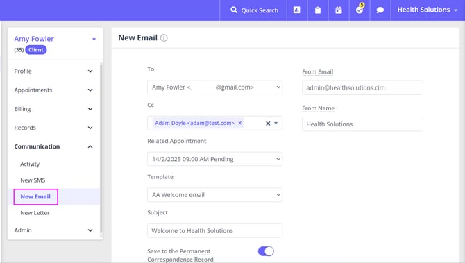 4. You can add additional email addresses in the CC field to send copies of the email to other recipients. If there are other profiles linked to this client profile in your account—such as contacts, referrers, or third-party payees—their email addresses will be available in the CC dropdown for easy selection. You also have the option to manually enter an email address in the CC field. However, for security reasons, there is a limit on the number of email addresses that can be entered manually. Additionally, when accessing Zanda on a mobile device, you will not be able to manually enter any extra email addresses.