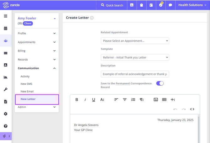 Send emails, SMS, and letters to clients from their Zanda record. Easily manage communications, forward SMS replies, and generate letters for efficient client correspondence.