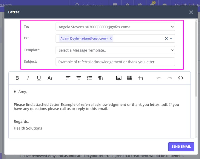 - When you send the letter as attachment, you will be able to select a custom email template created and saved in Tools Communication > Templates. If you do not select a custom email template, the system will use a default template for sending attachments. The 'From' email address in the default email template is populated from the Settings > Communication > Communication Options page, the 'Business Email Address' field. If no email address is entered there, the system will use the email address saved in Settings > Practice > Business Info.