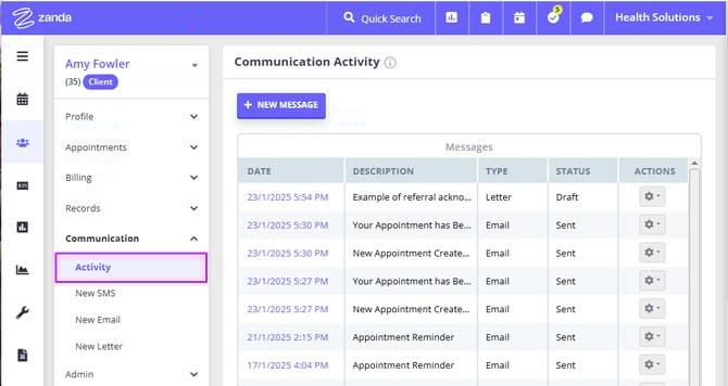 - The SMS you send via Zanda, and any client replies to your SMS, both will be logged in each client's profile under Communication > Activity.