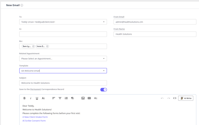 Hint 💡By default, communication will only be stored for 12-months. If you would like to permanently store a message or letter to a client's record you can select Save to the Permanent Correspondence Record prior to sending.