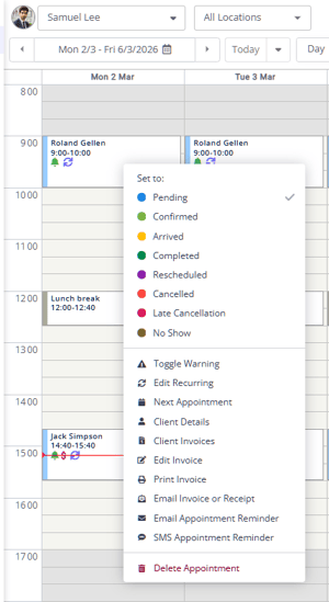 Once you have seen a client you may wish to enter the service provided or payment received, edit the amount charged or generate an invoice/receipt.
