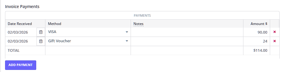 Use the "Add Payment" function to add a partial payment, or to add multiple payment methods (e.g. $90 VISA and $24 Gift Voucher).
